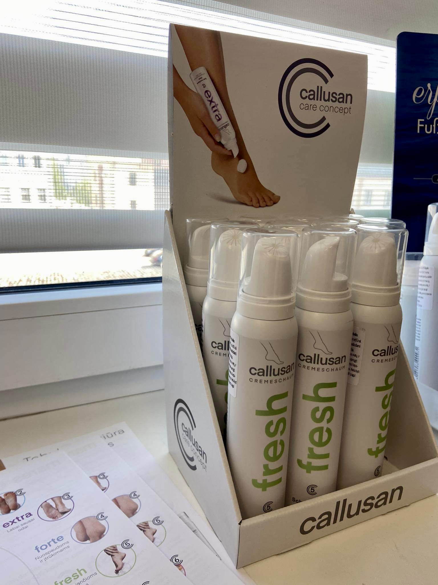Callusan FRESH putos – gaivą pėdoms suteikinati priemonė, puikiai tinkanti naudoti vasarą. Migdolų aliejus drėkina, o alantoinas mažina alergines reakcijas, uždegimus, ramina sudirgusią odą. Šalavijas ir mėta padeda išvengti nemalonaus kvapo ir apsaugo nuo grybelio. Putos puikiai tinka sportuojantiems.